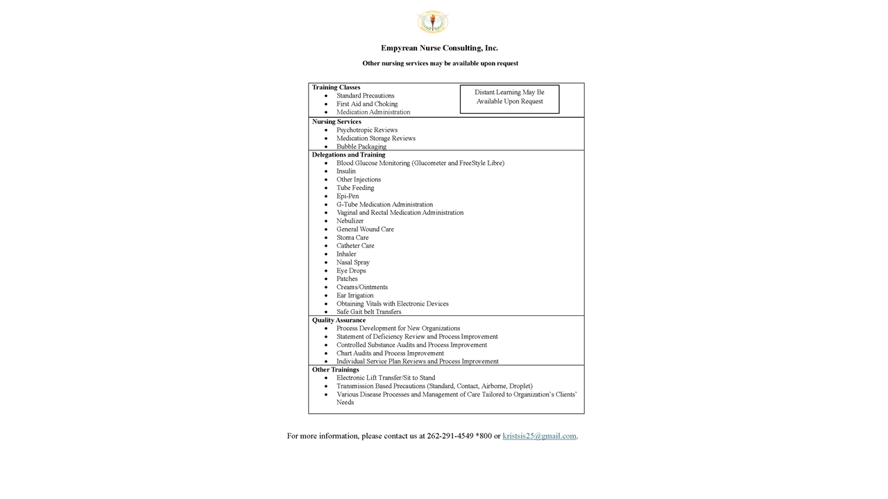 Empyrean Nurse Consulting offers decades of hands-on experience in healthcare that is dedicated to elevating the quality of care and operational excellence in assisted living communities. Our consulting services are tailored to the unique needs of assisted living facilities to help meet regulatory compliance, improve client outcomes, and foster a culture of safety and compassion.